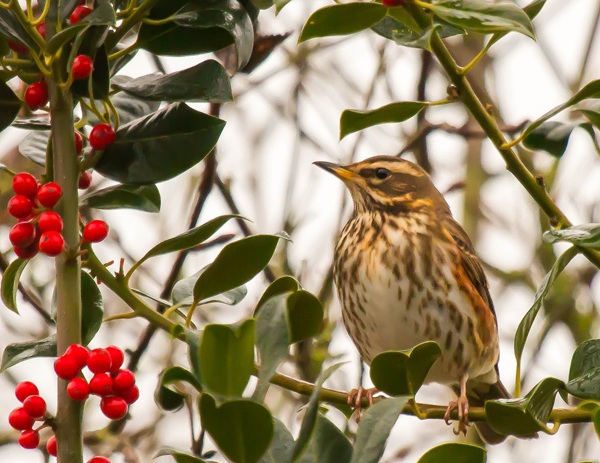 - Winterse Koperwieken plukken in Bavelse tuin van Aad van Diemen alle rode bessen uit de groene hulstbomen.