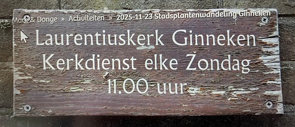 Ook bij de kerk stadsplanten in het Ginneken. Zie boven. Foto Aad van Diemen - Hernieuwde ontdekkingstocht Bleeke Heide. Zondagmiddag. 23 november. 13u30-16u. Net als 45 jaar geleden kijken en genieten op vogeltocht. Bleke Heide is hét winterse vogelparadijs, met grote waterplassen. Behouden dankzij bevlogen natuurliefhebbers. Start: P-‘vogelscherm Bleke Heide’. Oude Bredaseweg. Natuurpunt Markvallei.