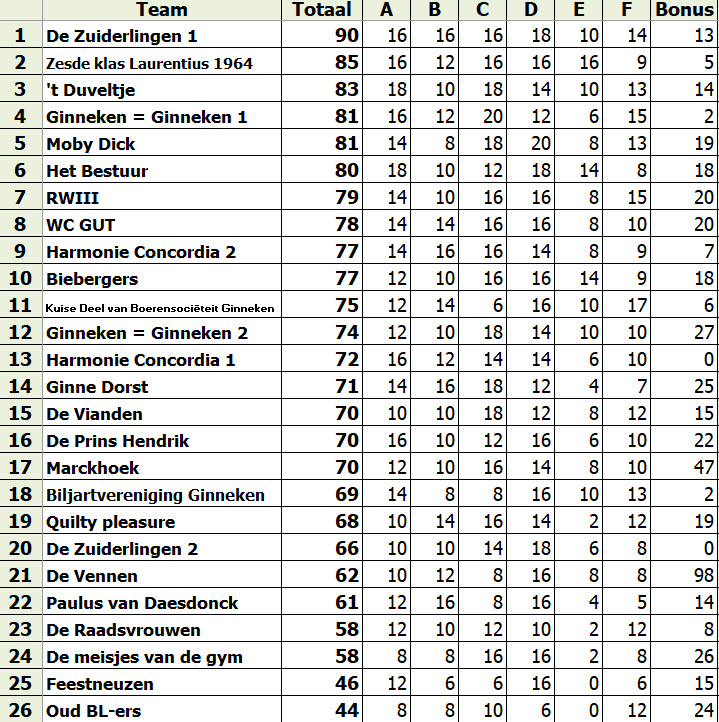De Zuiderlingen stonden al vanaf de eerste ronde in de top-3 en ze gingen als koploper de pauze in. Tegen het einde leek het nog mis te gaan omdat ze veel punten lieten liggen in de ronde Actualiteit, maar in de Fotoronde wisten ze ruim voldoende punten te scoren om de eerste plaats te heroveren. Het team Zesde klas Laurentius 1964 eindigde op de tweede plaats, net voor ’t Duveltje. Een van de teams van Ginneken=Ginneken deed het ook goed, zij eindigden op de vierde plaats, met een kleine voorsprong op Moby Dick, de winnaars van vorig jaar.